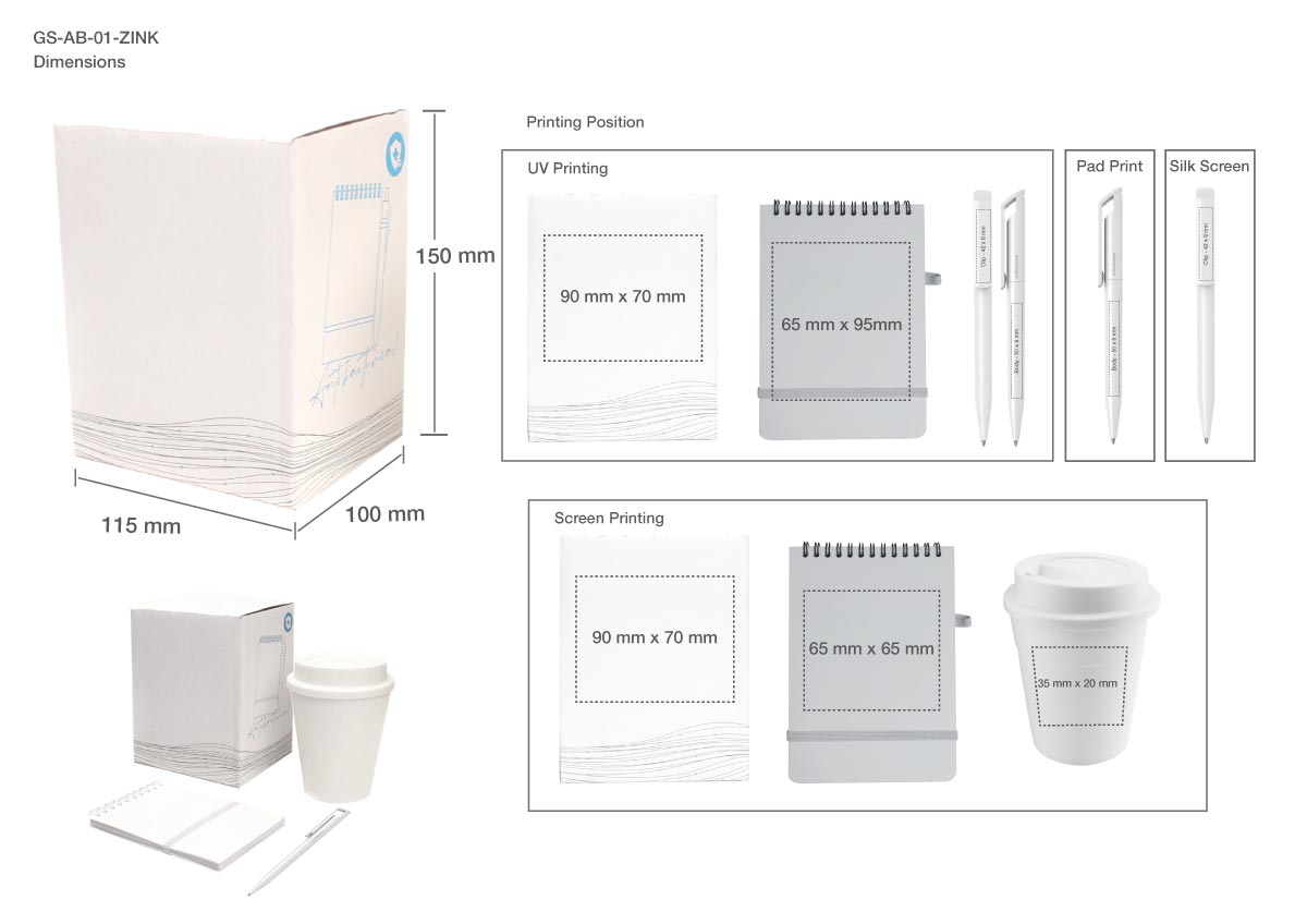 The product contains a Cup and Notepad Code: GS-AB-01 | Bay Pen: MAX-B500-C-AB-01 | Zink Pen: MAX-Z1-C-AB-01