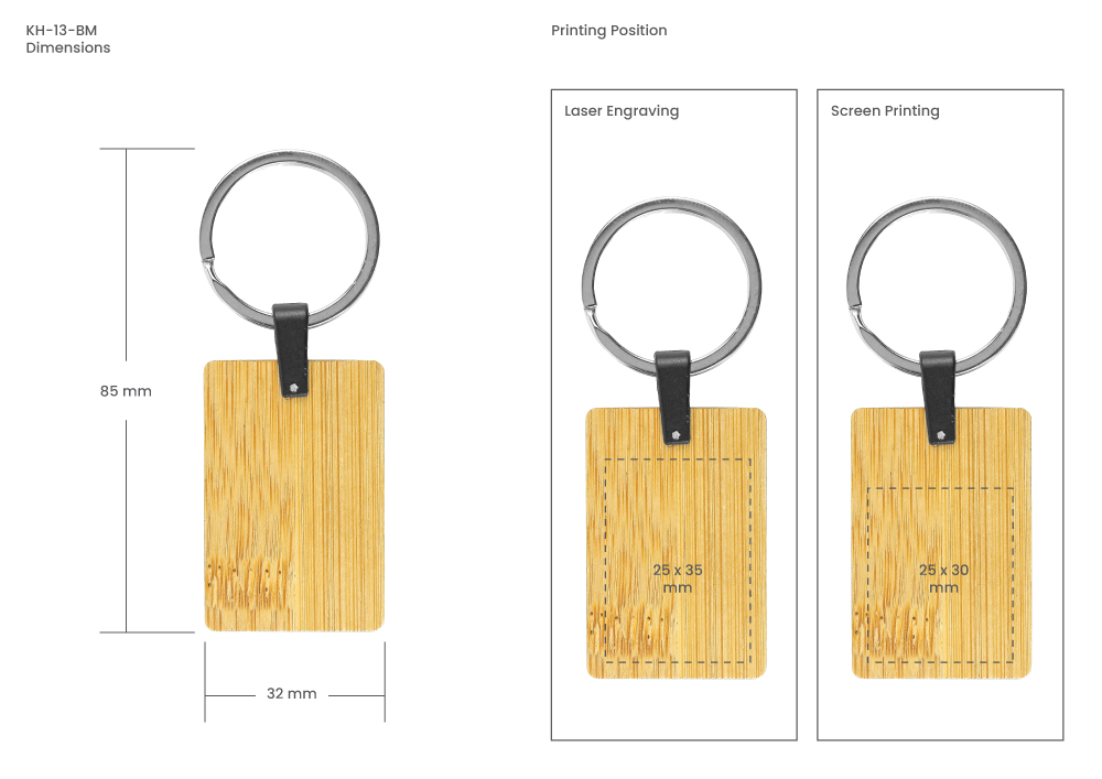 Bamboo and metal keychain rectangle, size 32mm, shiny nickel flat ring, and branding options.
