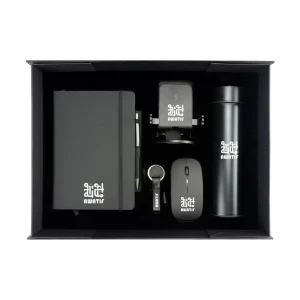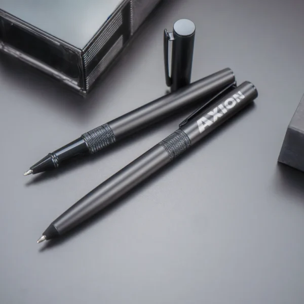 Showcase refined elegance with our Black Metal Pen Set featuring a premium matte finish and high-quality blue German ink. This sophisticated gift set includes a Roller Pen with a cap and a Ball Pen with a twist mechanism, both crafted from durable metal for a smooth and lasting writing experience. The set is beautifully presented in a Champagne-colored hardboard slide-to-open box with a soft velvet foam interior, making it a perfect choice for executive gifts, business promotions, and corporate branding.