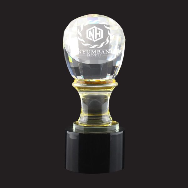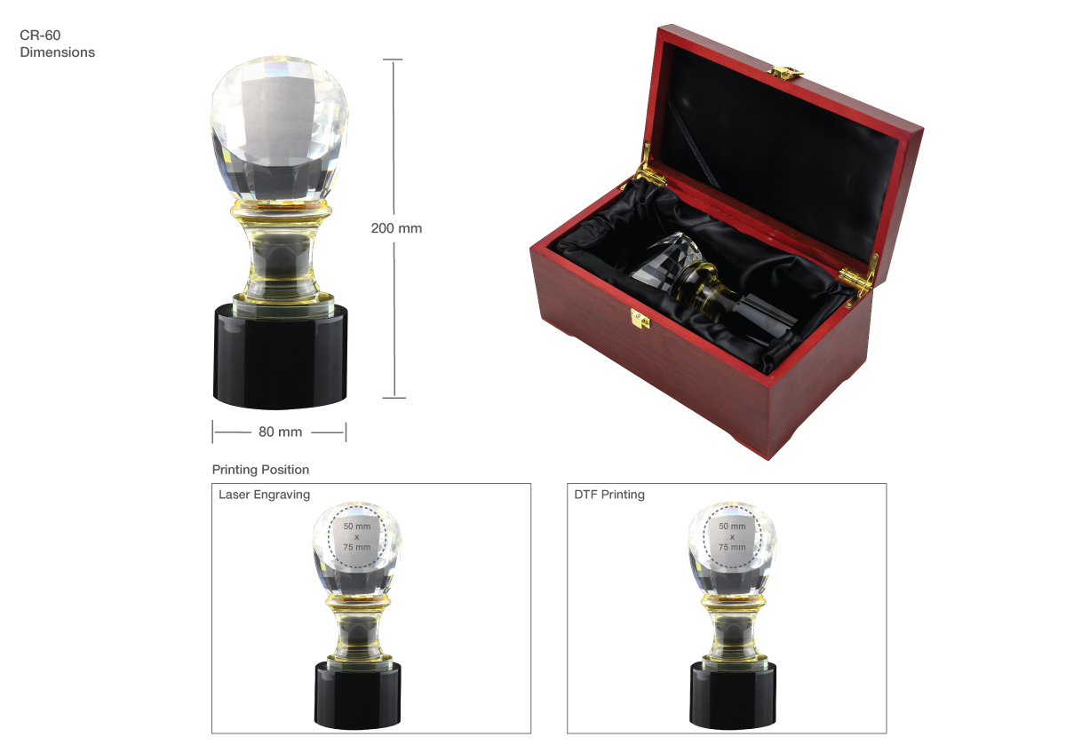 Crystal glass trophy 20 cm with round black base presented in the mahogany color wooden box.