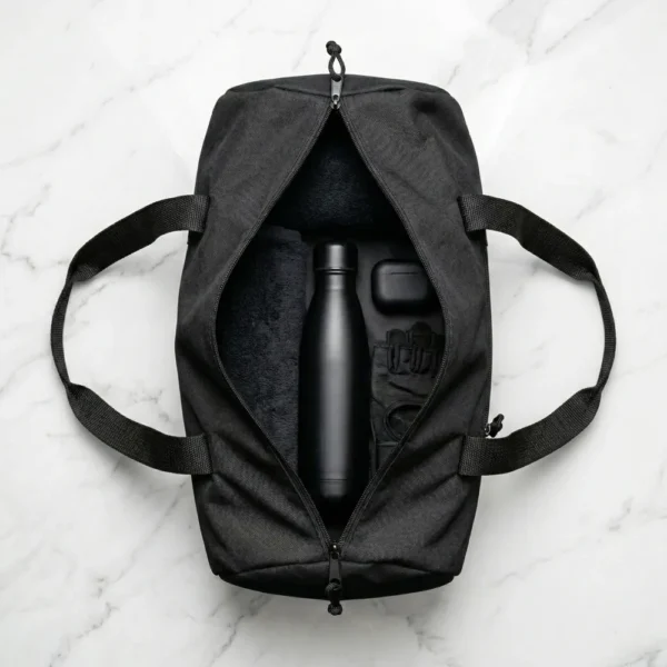 Durable and spacious duffle gym bag made from high-quality polyester, designed for everyday fitness routines, travel, and sports activities. This sleek black bag features a large main compartment with a zipper closure and a convenient front pocket for easy organization of essentials. Its lightweight yet sturdy construction makes it ideal for gym sessions, short trips, and outdoor activities while maintaining a professional and sporty appearance.