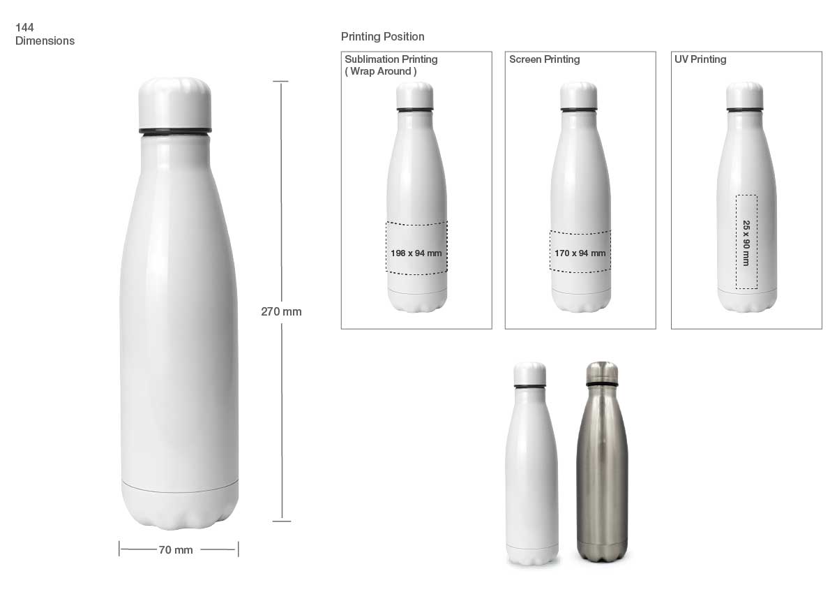 The bottles are crafted from original stainless steel material making them durable and long-lasting. The stainless steel protects your water, tea, and coffee from harmful UV rays and overheating. It also helps to keep your beverages like tea and coffee to remain hot. These stainless steel bottles are the right choice for thermal bottles. It has a strong rubberized lid for no leakage of water. Besides, the stainless steel material the bottle is lightweight and easy to carry. The total capacity of these personalized water bottles is 500 ml. It has a slim and compact structure so it can easily fit your bags. Customized bottles that are widely used also will help your brand attract people’s attention.