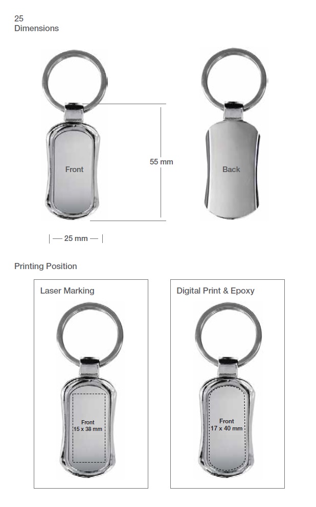 - Rectangular Oval Keychain with a Shiny chrome finish.