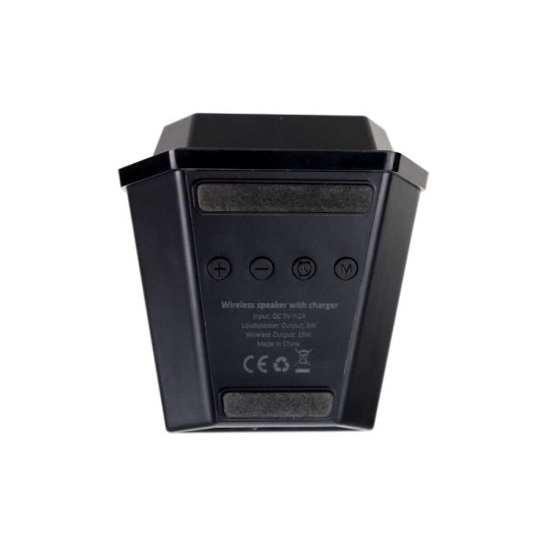 Multi-function wireless charger Bluetooth speaker with digital alarm Clock that is made from Black ABS Material with White LED Light for Light Up Logo Functions.